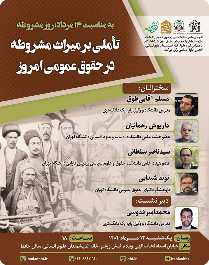 نشست «تأملی بر میراث مشروطه در حقوق عمومی امروز» امروز (یکشنبه، 12 مرداد 1404) در سالن حافظ خانه اندیشمندان علوم انسانی برگزار میشود. در این نشست که در آستانه 14 مرداد، روز مشروطه برگزار خواهد شد، مسلم آقایی طوق، مدرس دانشگاه و وکیل دادگستری، داریوش رحمانیان، عضو هیأت علمی دانشکده ادبیات و علوم انسانی دانشگاهContinue reading “نشست «تأملی بر میراث مشروطه در حقوق عمومی امروز» امروز برگزار میشود”