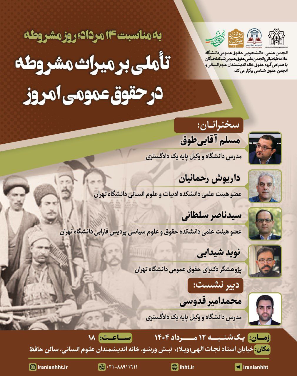 نشست «تأملی بر میراث مشروطه در حقوق عمومی امروز» امروز (یکشنبه، 12 مرداد 1404) در سالن حافظ خانه اندیشمندان علوم انسانی برگزار میشود. در این نشست که در آستانه 14 مرداد، روز مشروطه برگزار خواهد شد، مسلم آقایی طوق، مدرس دانشگاه و وکیل دادگستری، داریوش رحمانیان، عضو هیأت علمی دانشکده ادبیات و علوم انسانی دانشگاهContinue reading “نشست «تأملی بر میراث مشروطه در حقوق عمومی امروز» امروز برگزار میشود”